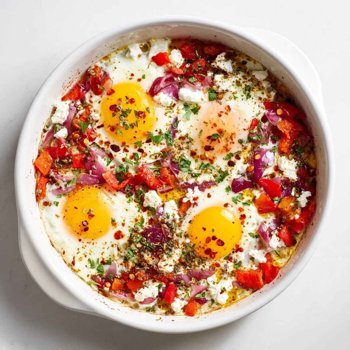 Transform your morning routine with this Mediterranean-inspired dish featuring tangy feta cheese, perfectly baked eggs, and colorful vegetables. The creamy cheese melts into sautéed tomatoes, onions, and bell peppers, creating rich wells for your eggs to cook. Finished with aromatic oregano and fresh parsley, this dish comes together in under 30 minutes while delivering impressive presentation and flavor. Perfect for two servings, it pairs beautifully with crusty bread for soaking up those delicious juices.