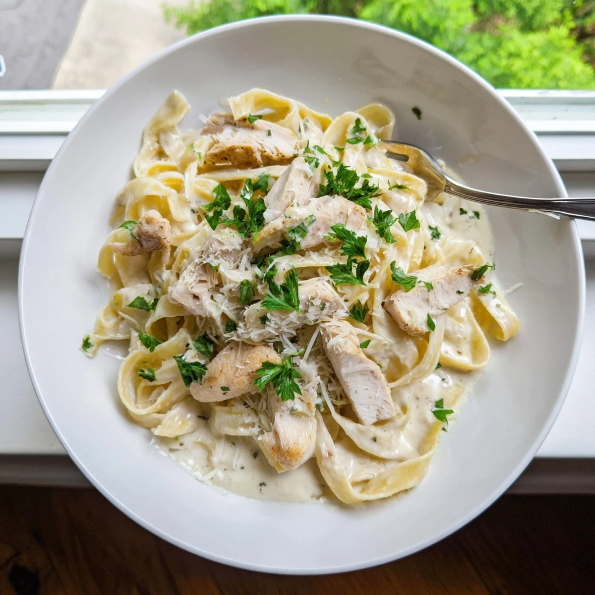 This indulgent Italian-American classic combines golden pan-seared chicken breast with perfectly cooked fettuccine, all coated in a silky homemade Alfredo sauce. The sauce comes together by simmering heavy cream with butter and garlic, then stirring in freshly grated Parmesan until melted and smooth. A hint of nutmeg adds depth, while reserved pasta water helps achieve the ideal consistency.
