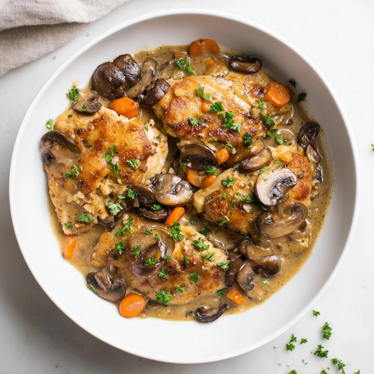 This dish combines tender boneless chicken thighs with sautéed mushrooms and aromatic vegetables in a rich, creamy mushroom sauce. Garlic, onion, and carrot add depth, while white wine and chicken stock build flavor layers. Finished with fresh parsley, it's a comforting and hearty option ideal for an easy dinner. Serve alongside mashed potatoes or crusty bread for a satisfying meal.