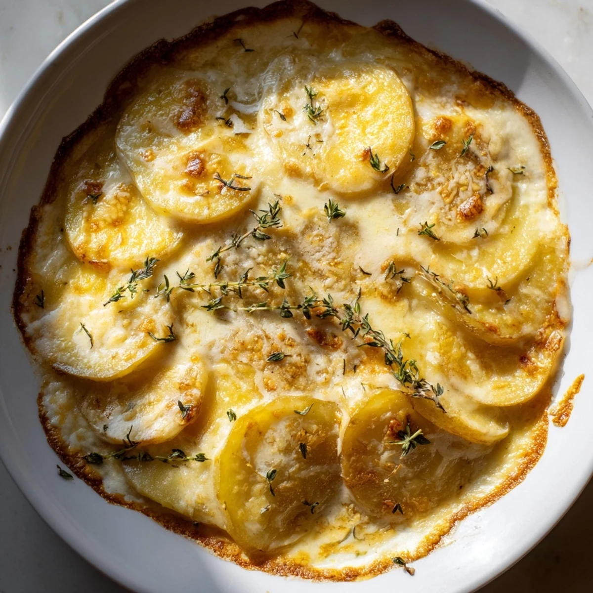 This French-inspired dish features thin potato slices layered with a creamy mixture of milk, cream, Gruyère, and Parmesan cheeses, infused with fresh thyme and subtle nutmeg. Baked to a golden, bubbling finish, it offers a rich, comforting flavor ideal as a side or vegetarian main. The layering technique ensures tender potatoes and a luscious sauce, while thyme adds a fragrant herbaceous note. Perfectly paired with roast meats or crisp salads, it delivers a satisfying combination of textures and flavors, with options to customize cheeses or spice.
