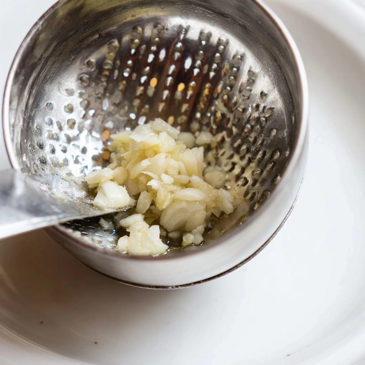 - Use a knife or spatula to scrape the crushed garlic from the outside of the crusher.