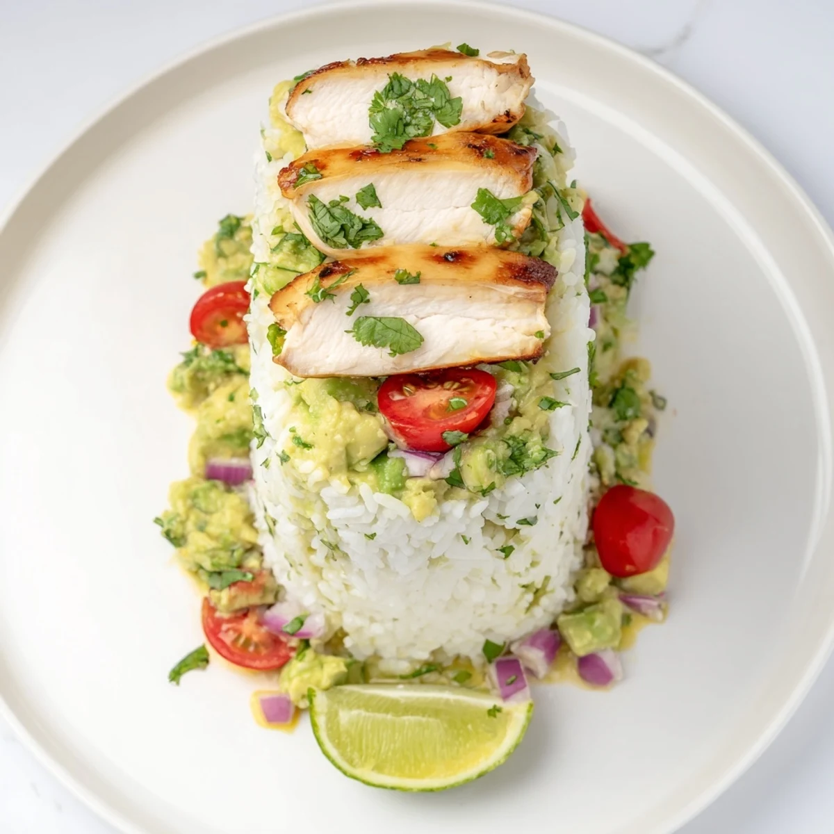 - Layer the fluffy rice as your foundation then add the creamy avocado mixture and top with sliced chicken. Finish with red onion cherry tomatoes fresh herbs and those extra lime wedges.