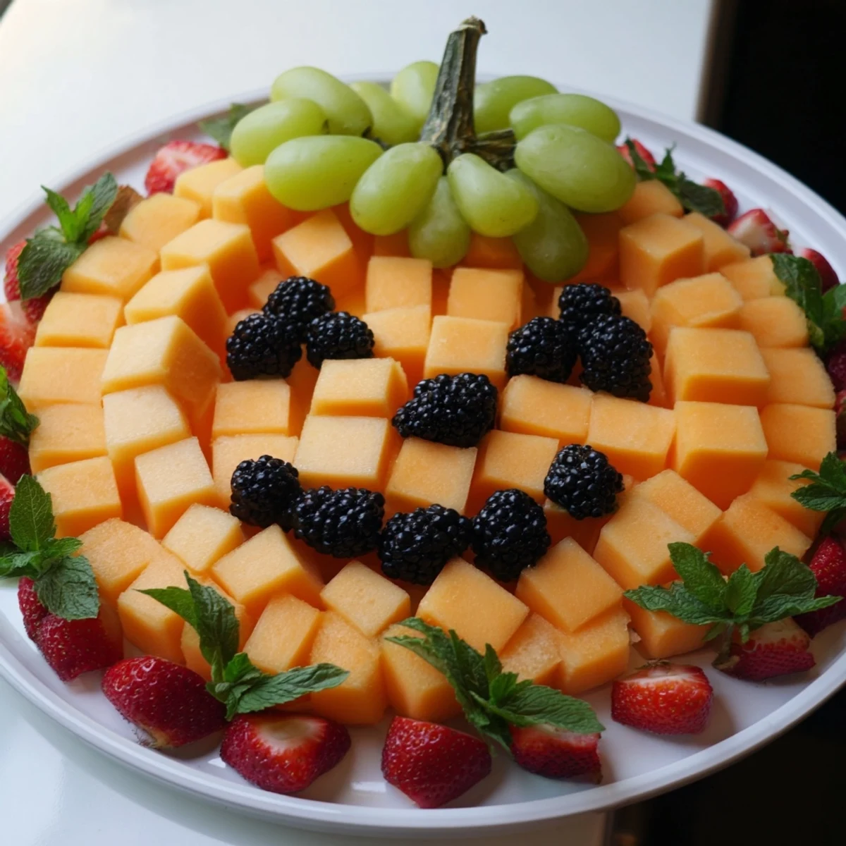 A white platter makes those orange melon cubes really stand out, though any serving dish with high sides works for transport. If you are bringing this somewhere, consider assembling the pumpkin body at home and adding the face when you arrive.